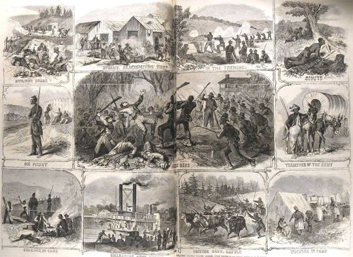 "Emancipation Day in South Carolina" - the Color-Sergeant of the 1st South Carolina (Colored) addressing the regiment, after having been presented with the Stars and Stripes, at Smith's plantation, Port Royal, January 1, 1863